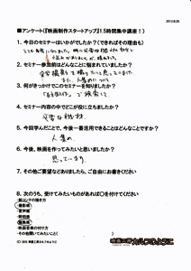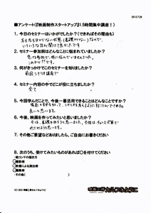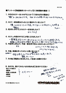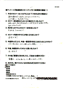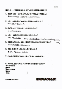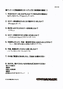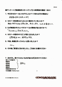 この講座では、映画を作る最初のステップをお伝えします。 『映画の作り方』というのは、当然のことながら、一つではありません。 皆さんがどんな段階かによって、必要なアドバイスは違ってくるんです。 ただ、 ゼロから学ぶ、というのは、ある程度の「効率的な指導」が必要です。 ![]() たとえば、ギターを始めたいとします。 ギター教室に通い始める人もいるでしょう。 知り合いにギターが上手な人がいれば、その人に習うこともできるでしょう。 でも、近くに教室が無かったり、知り合いもいなかったり、いきなり月謝を払うのも・・ という方は、どうするでしょうか。 まず、初心者向けのギターを買ってきて、家で一人で練習するところから始めませんか? そして、ちょっと詳しい、先輩からアドバイスもらいませんか? ![]() サッカーを始めようとしている人に、ワールドカップ優勝チームのアドバイスは、 憧れ・励みにはなりますが、必ずしも実践的ではないでしょう。 それらの情報が高度すぎて手が出せない! なんて判断してしまうこともあったりします。 もったいない! 効率的に学ぶには、無駄なく必要な情報を得るには、ステップが必要なんです。 このDVDセミナーは、「初めて一歩を踏み出す人」に完全に焦点を合わせています。そして、 何度でも見直す事ができます。まずは、全体像を知るために第1部のセミナーを見て、 次に、実際に準備をしている時に、第2部のセミナーを見る。 そんな見方がいいかもしれません。 見ておしまい、ではありません! 質問無制限!気になったところ、さらなるご質問、何度でも、どしどし受け付けます!今は、映画作りの質問が、 「カメラはどれがいいですか?」 「スタッフは何人集めればいいですか?」 という漠然としたものであると思います。 でも、この講座を一度でも聞いた後は、 質問内容が、びっくりするくらい具体的になります。 具体的な質問は、具体的に答えられます。 つまり、映画作りが具体的に進みだすんですね。 受講者の声(アンケートから一部抜粋)